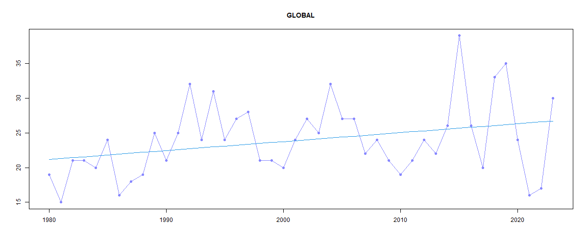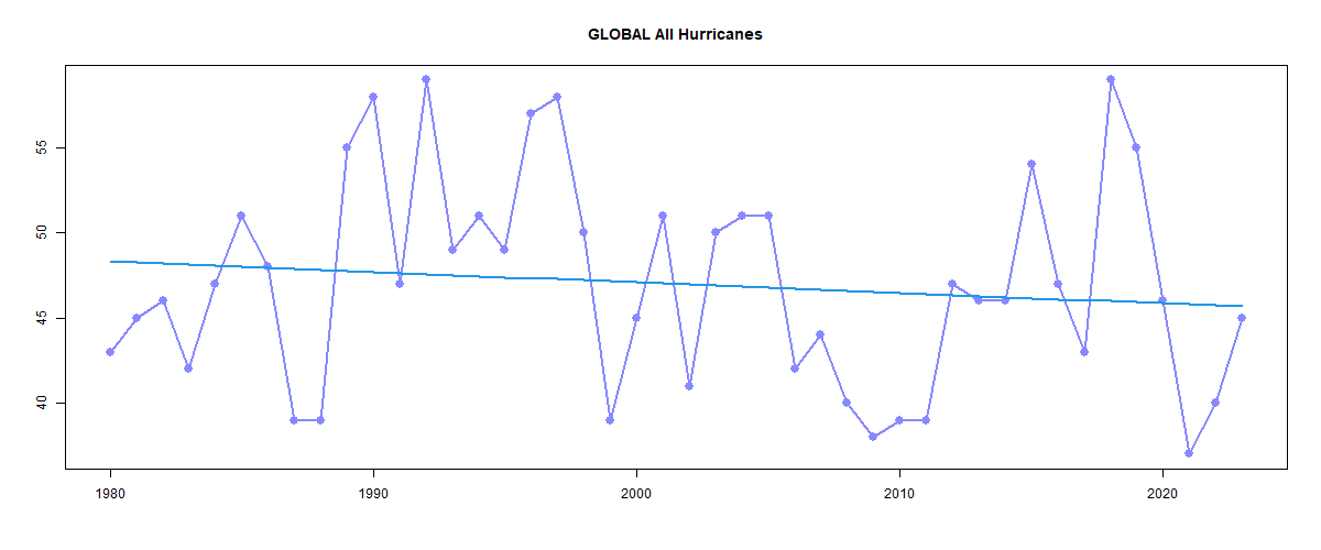 And here is the plot of numbers of hurricanes of all strength: