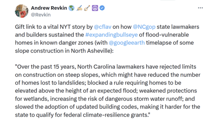 I find it difficult to sympathize with the grief of someone who provides Hollywood “story support for the age of climate change” because reality paints a different picture of the world. The data show that Helene was a rather typical hurricane in hurricane alley that occurred in the hurricane season. Devastating floods in Asheville have occurred before and evidence suggests that the greater flood peak was probably due to development. There is nothing to suggest that this is anything, but an extreme weather event. It certainly is no evidence of any kind of worsening climate change impacts.