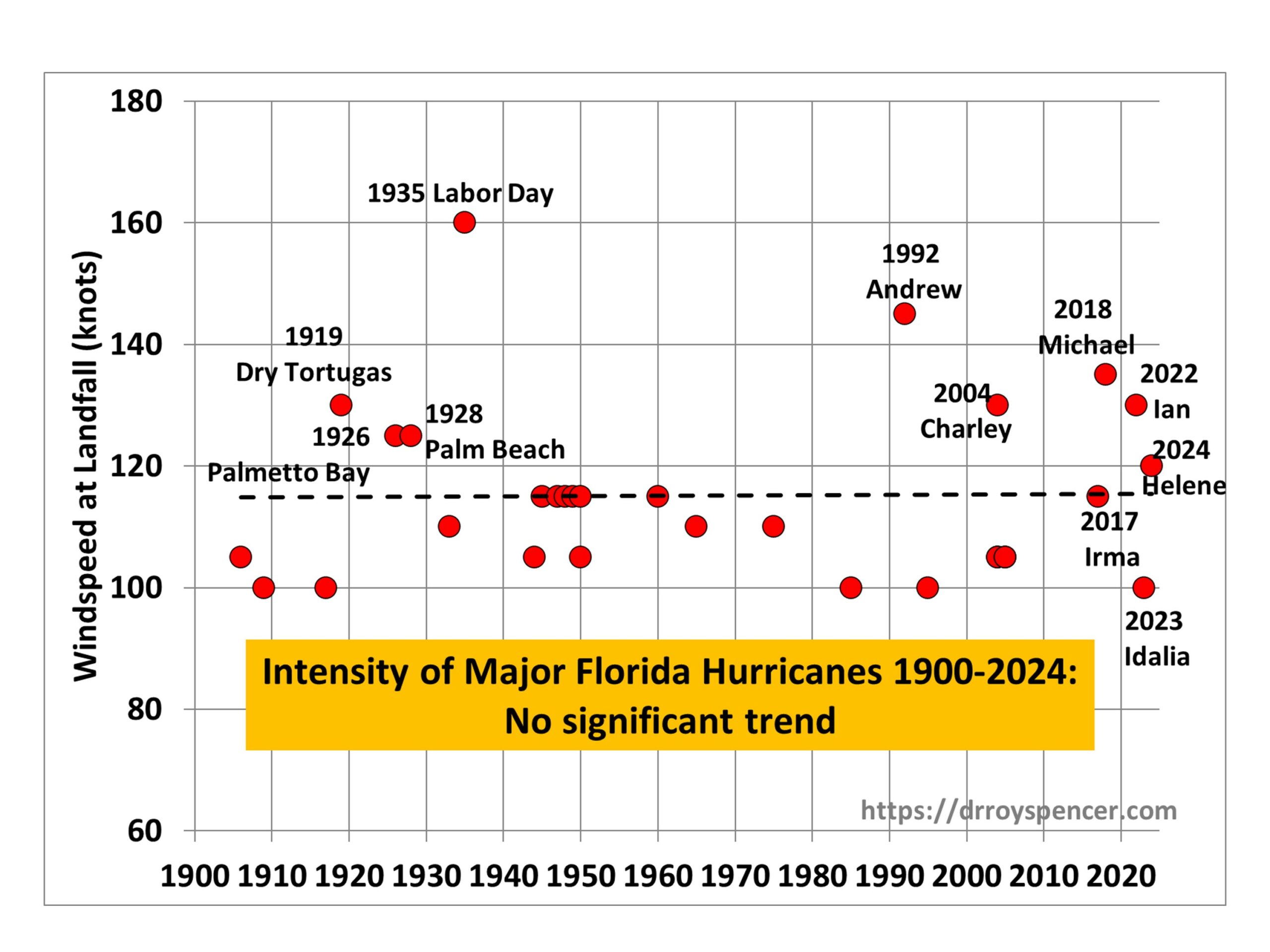 The following plot shows the intensity of major hurricanes (100 knots or greater maximum sustained wind speed) striking Florida since 1900, updated through recent (2024) Hurricane Helene: