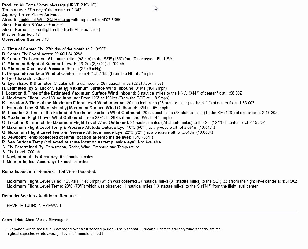 Yes, the attached data from a hurricane hunter aircraft about an hour before Helene made landfall measures the max surface wind speed via SMFR at 104-106 mph: