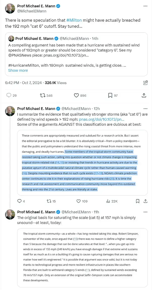 He’s not talking about the Saffir-Simpson scale. He’s talking about the proposal by [Wehner & Kosslin 2024]. I’m not saying the Wehner-Kosslin scale proposal should necessarily be adopted or that Mann isn’t full of baloney. I’m just pointing out that this isn’t strictly about the Saffir-Simpson scale. And just so nobody gets the wrong idea about my position on the matter…as I’ve said before I don’t think an intensity scale based solely on maximum wind speed regardless of whether it is Saffir-Simpson, Wehner-Kosslin, or something else is the best option anyway. A kinetic energy scale based on [Powell & Reinhold 2008] or similar has been shown to be more discriminating of a cyclone’s true destructive potential.