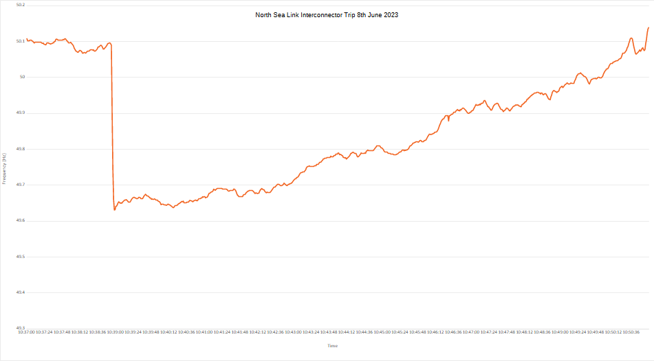 The frequency took rather more than 2 minutes to return to normal. 5 mins to regain 49.8Hz. Almost 10 mins to hit 50Hz.