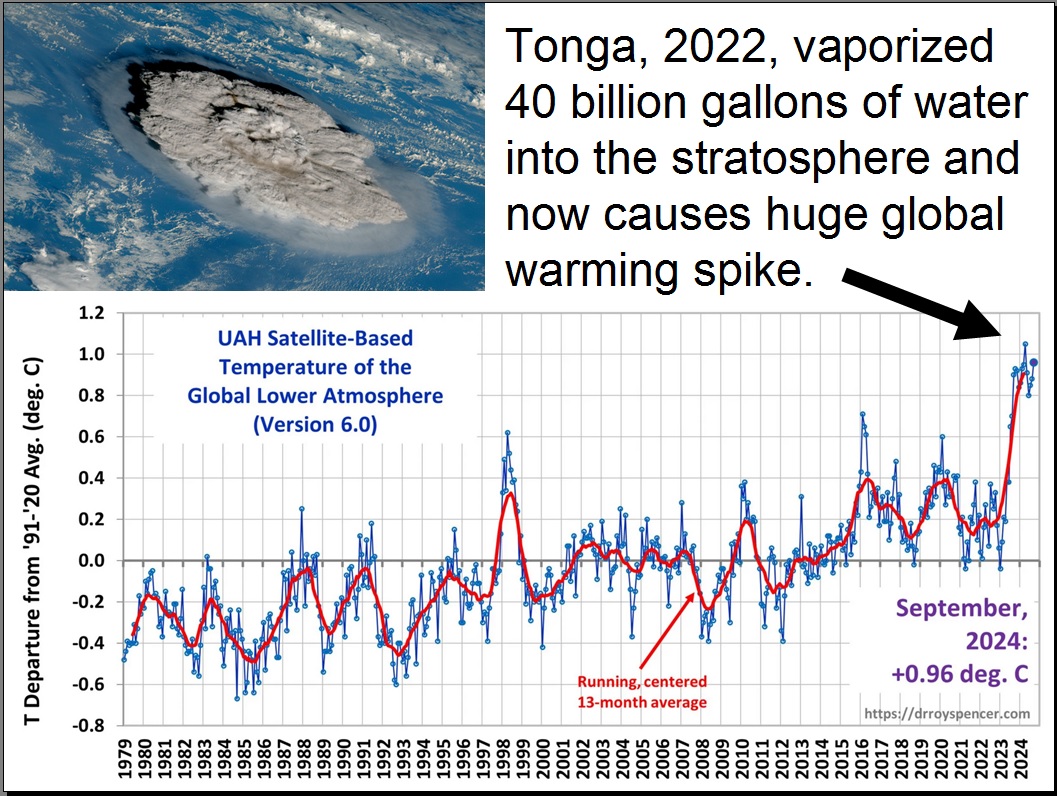 WHAT??? . . . absolutely no mention anywhere in the above article of the Hunga-Tonga volcano eruption of January 15, 2022, which was supposed to have injected an estimated 150 million metric tons of water vapor into the stratosphere . . . and thus has been hypothesized to be the strangely-delayed cause of the spike of global warming as seen in upward breakout of UAH GLAT tracking starting around mid-2023 (see UAH graph in right-hand column of this webpage).