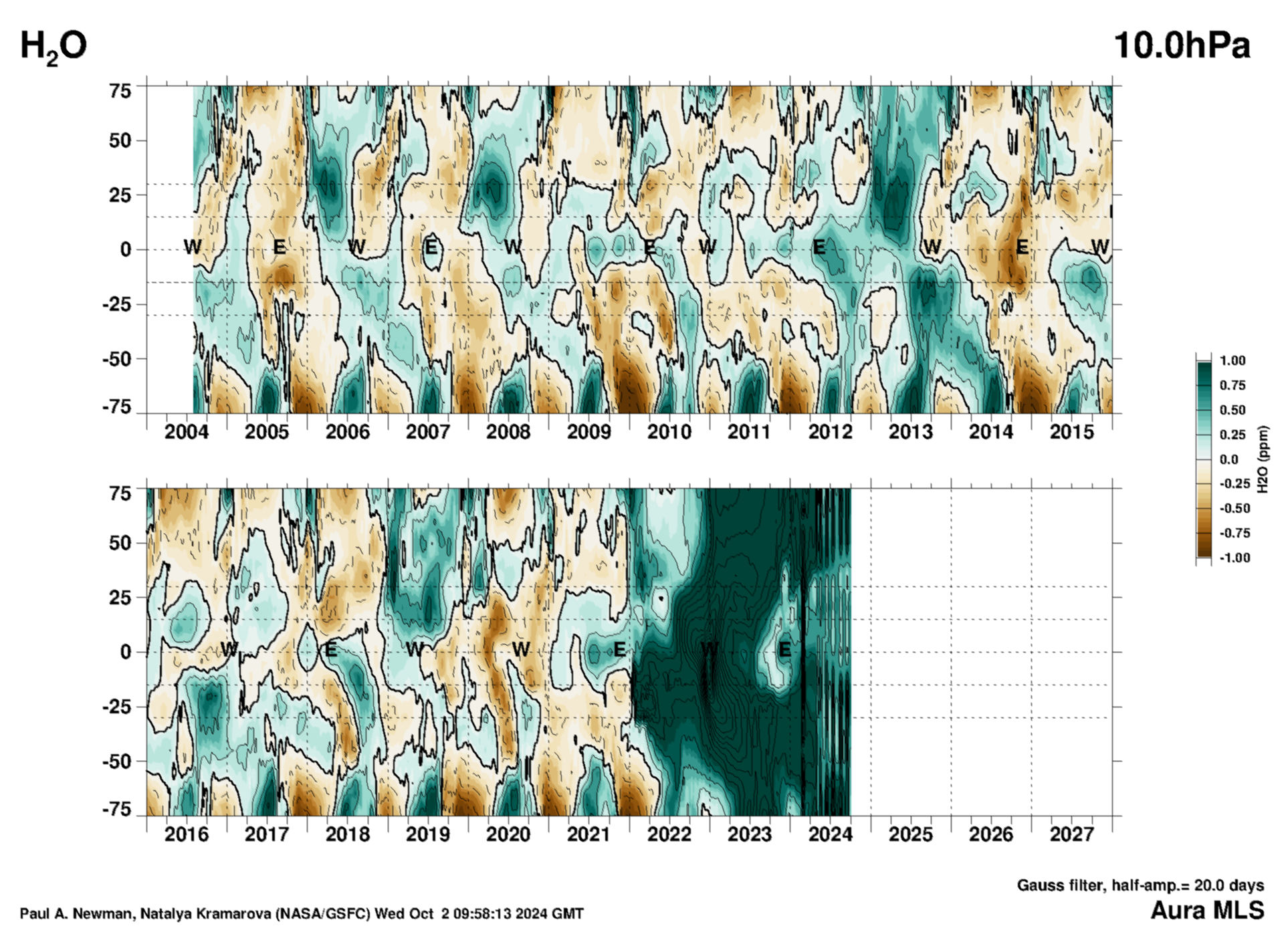 Oh, no . . . you just had to go and present the Aura MLS contour chart of stratospheric water content at the 26 hPa pressure level, which shows the rapid emergence of a significantly reduced water vapor “hole”—a relative decrease of about 0.75 ppm H2O happening over about 6 months— within about +15 N to -15 S of the equator.