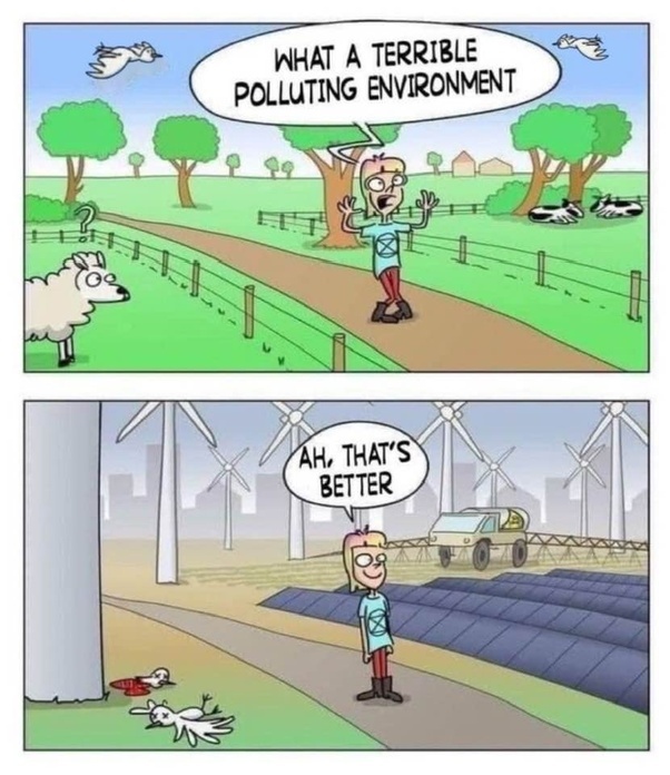 We can ignore the damage done by wind and solar, the cost, and the total inefficiency of the whole process which is about 30% energy efficient or less. We are saving the planet, so nothing else matters.