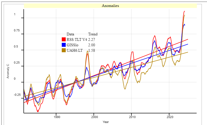 Here are GISS, UAH and RSS plotted with 12-month smoothing at a common anomaly base of 1981-2010. RSS has the highest trend (equally with no UHI), UAH the lowest. But there isn’t enough difference to prove or disprove anything about climate models.
