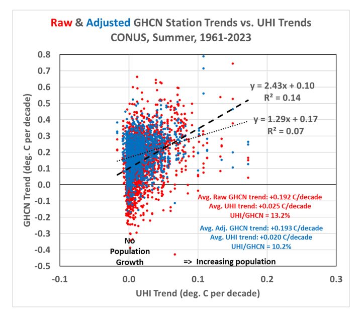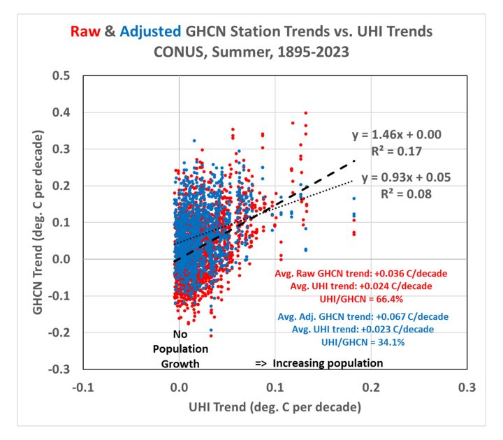 The method allows us to compute UHI trends using global gridded PD datasets that extend back to the 1800s. These UHI trends can then be compared to GHCN station temperature trends. If I do this for all U.S. GHCN stations having at least 120 years of complete monthly (June, July, or August) data out of 129 potential years during 1895-2023, the following plot shows some interesting results. (I begin with the “raw” data so we can then examine how homogenization changes the results.)