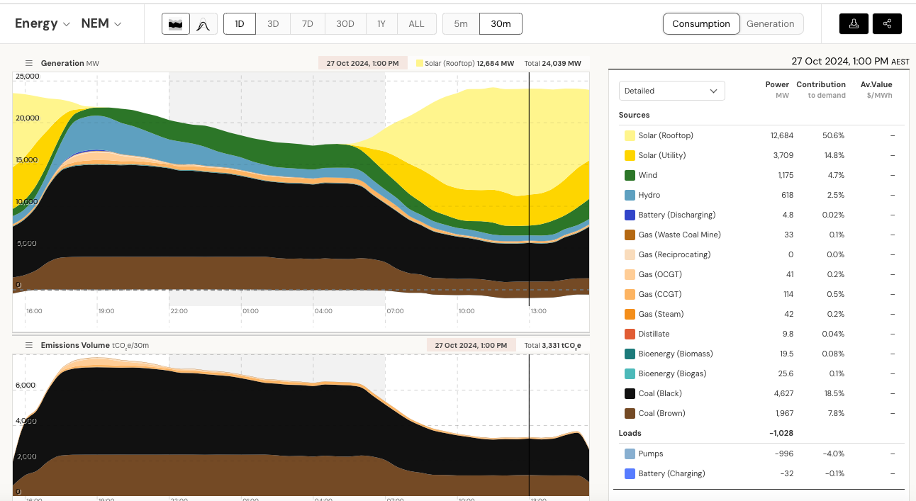 Rooftops in Australia are often the largest lunchtime generator. Today rooftops were supplying 50% of the NEM demand. South Australia demand was negative and the rooftops in the region were exporting to Victoria. Wholesale prices in SA went negative at 0720 and are still negative at 1600.