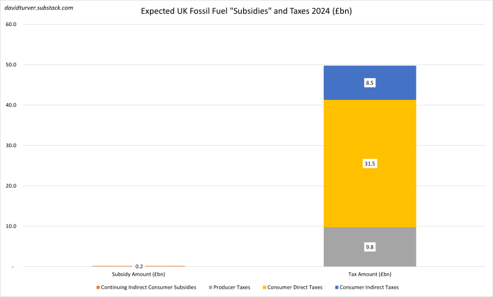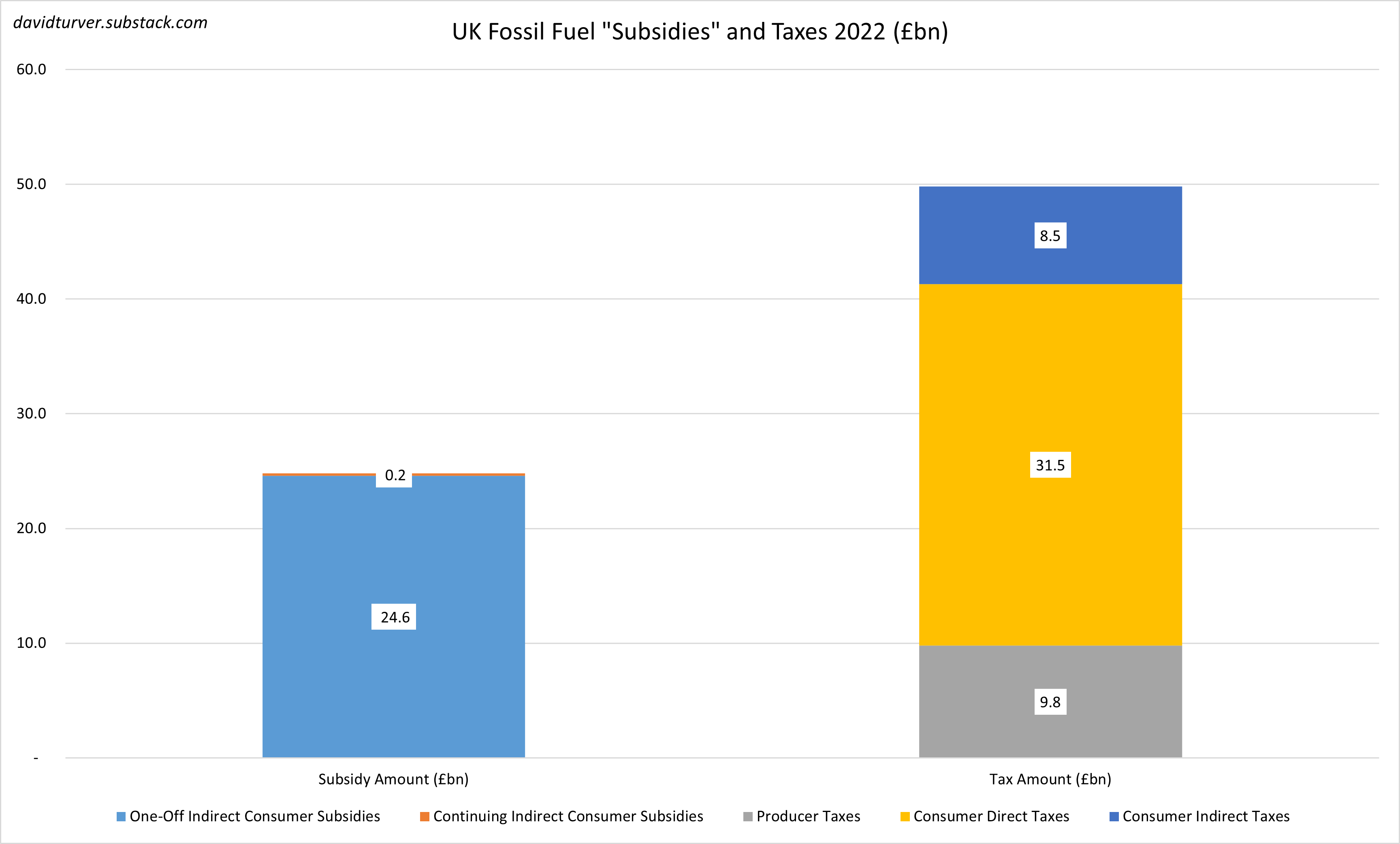 First, we can dismiss the so-called subsidies for producers as normal business expenses deducted from taxable profits. We can also dismiss all but the £0.2 billion Warm Home Discount ongoing consumer “subsidies” as simply lower taxes for some uses of fuel. Tax is still tax and lower tax is not a subsidy. If we are generous to those who claim we subsidise fossil fuels, we could note that in 2022 there was about £24.6 billion of one-off indirect subsidies. However, these schemes are now no longer in operation.