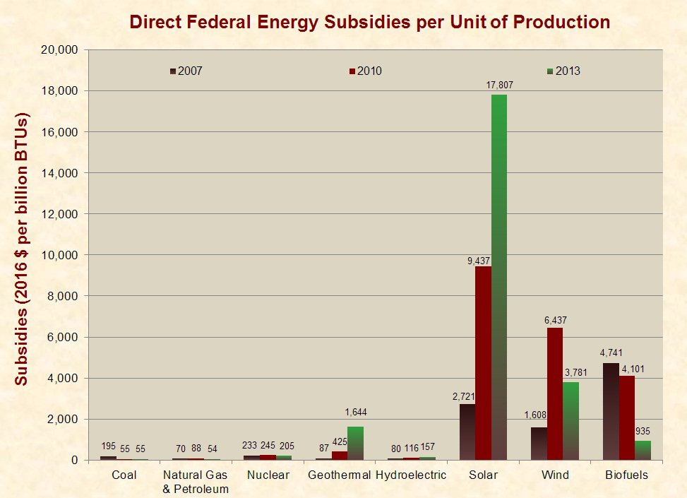 As contrasted to the massive subsidies provided to producers of wind and sola (but not nuclear or hydro), as well as subsidies paid to customers who purchase solar systems, electric vehicles, etc.