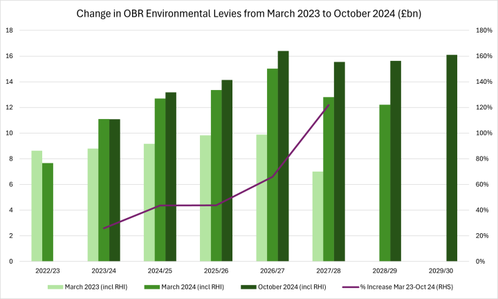 Unfortunately, the Budget 2024 bad news keeps on coming because the OBR has also delivered an updated estimate of the costs of environmental levies. These include the costs of the Renewables Obligations and Contracts for Difference subsidy schemes plus the cost of the capacity market, green gas levy and the Renewables Heat Incentive. The summary results, showing the progression from March 2023 through to October 2024 are shown in Figure 3.