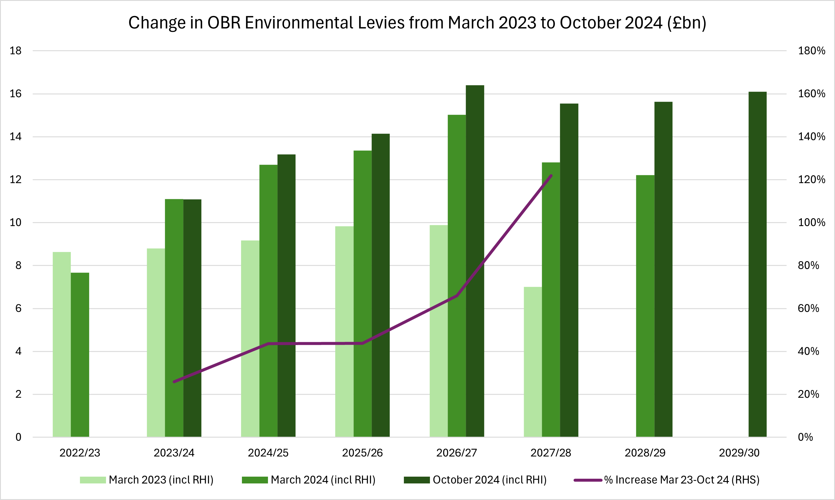 The latest figures show overall green levies are forecast to rise from about £11 billion in 2023-24 to a peak of £16.4 billion in 2026-27, before falling back to £15.5 billion in 2027-28. This latter figure is some 122% (i.e., more than double) what was forecast in March 2023 for the same year.