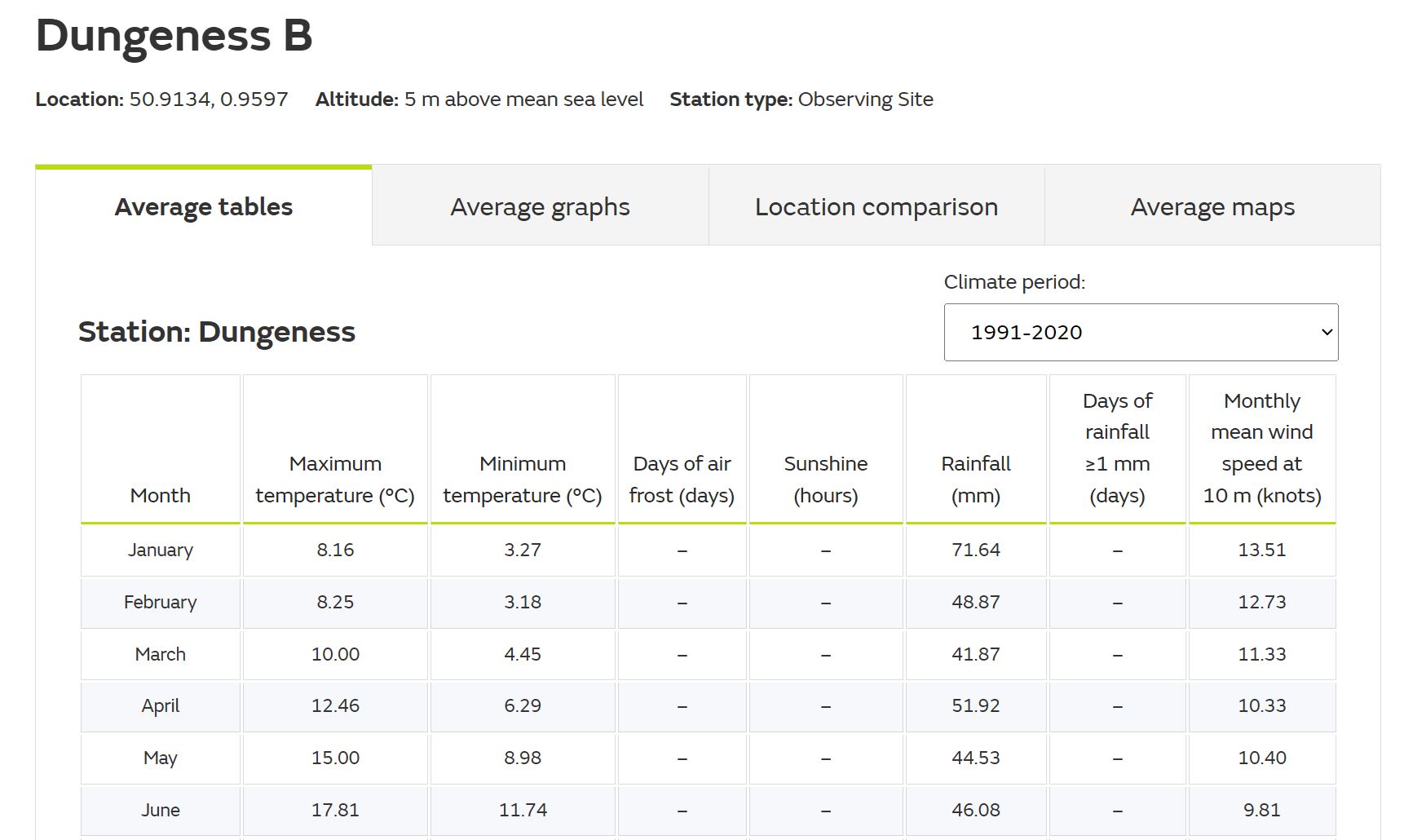 However, there is NO weather station at Dungeness – it closed in 1986 – i.e. 38 years ago.