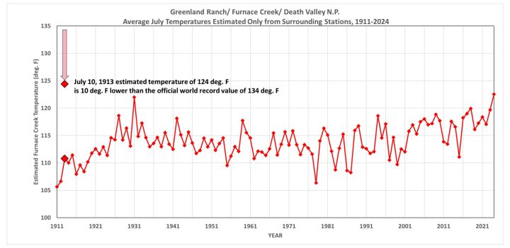 Fig. 2. Yearly estimates of July average temperature at Furnace Creek, CA based upon all available GHCN stations within 100 miles of Furnace Creek. Each yearly estimate is based upon upon the station data from that year. The indicated estimate on July 10, 1913 (the date of the world record 134 deg. F reported reading) is 10 degrees cooler than the world record, at 124 deg. F. This 1-day estimate is based upon the surrounding stations only on that date. Note the 2024 value is about 0.5 deg. F above the value in 1931.
