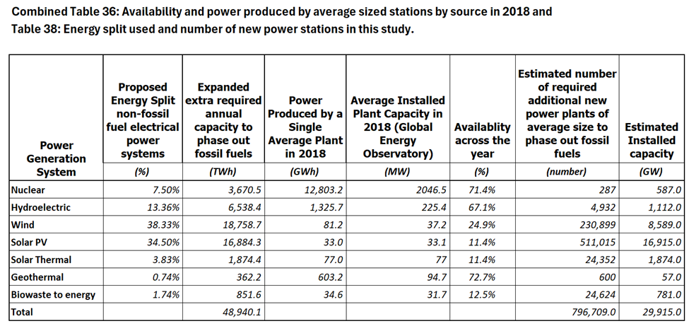 Given that Michaux is trying to estimate global energy use it is understandable that there are many simplifying assumptions. For the intended purpose I do not think any of my observations would change the general results, i.e., I believe the estimates are close enough for results that are the right order of magnitude. My primary interest is the electric sector. Section 14: Performance of existing fleet of electricity generation power stations estimates the availability and power production in Table 36. In Table 38 the assumptions and estimated number of power stations needed to replace fossil-fired power stations are listed. In the following table I combined data from both tables.