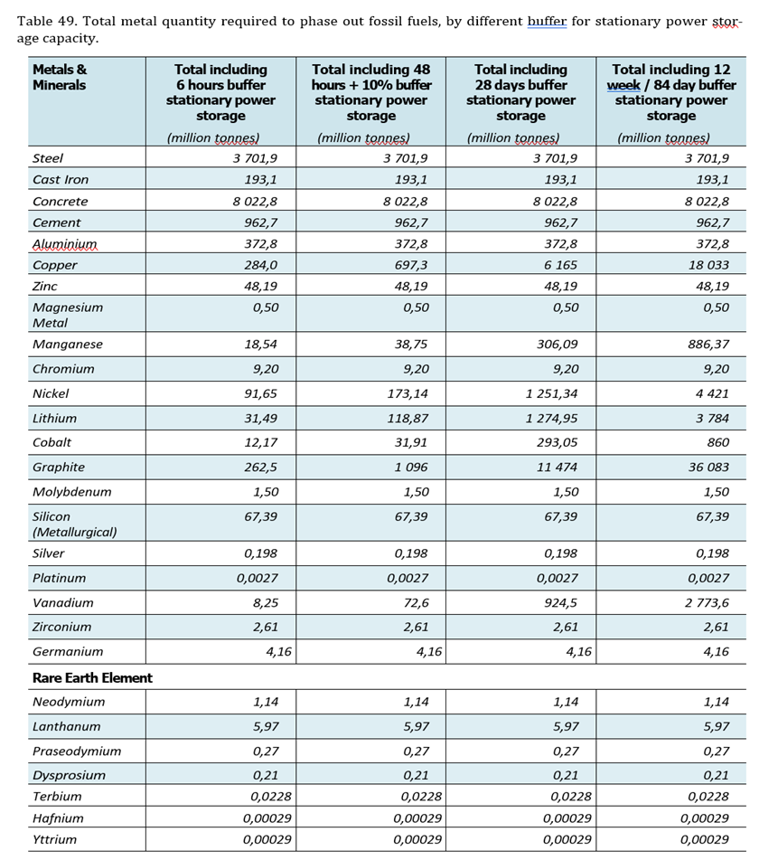 In an analogous process Michaux calculated the number of zero-emission “technology units” needed to replace fossil fuels in industry and transportation. Electric vehicles are an example of a technology unit. Fuel cell vehicles are also included. Table 49 from the article is the sum of all metal from all parts of this study into one quantity by metal (split into the four different power buffer storage capacities).