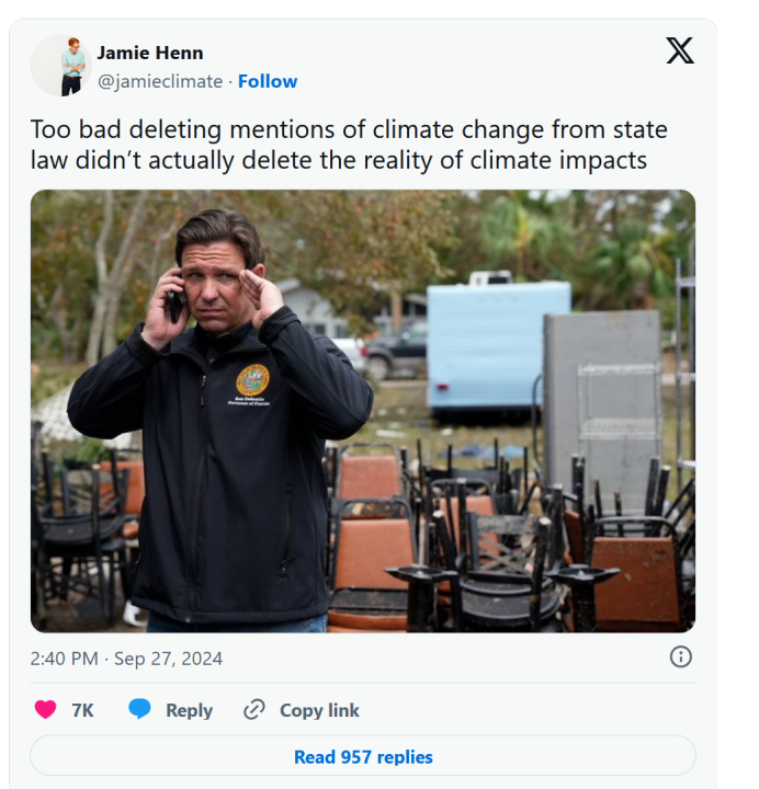 On September 27th, climate activist Jamie Henn pinned the flooding in Florida from Helene on Governor Ron DeSantis for “deleting mentions of climate change from state law,” as if that would magically stop hurricanes from striking during peak North Atlantic hurricane season.