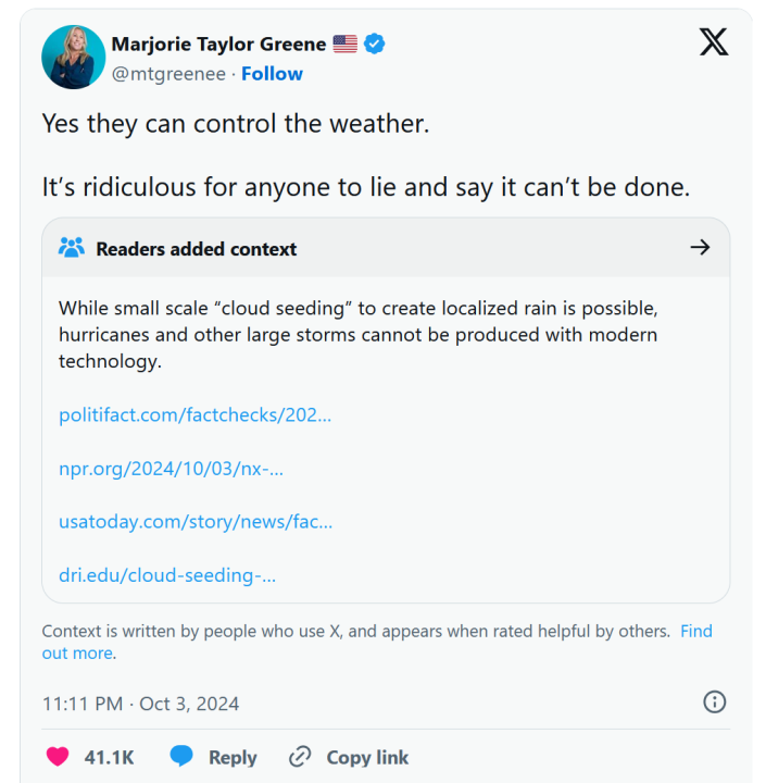 These claims have resurfaced amidst the aftermath of Hurricanes Helene and Milton, both of which struck Florida less than two weeks apart, intersecting with the politically charged rhetoric ahead of the nearing presidential election. Helene, in particular, was devastating because of the flood damage its remnants wrought on the Carolina backcountry and eastern Tennessee, in addition to the enormous death toll by modern standards. So far, Helene has been confirmed to have claimed over 250 lives, making it the deadliest natural disaster in the United States since Hurricane Katrina in 2005. Both storms are estimated to have inflicted hundreds of billions of dollars in damage, and rebuilding efforts could take years.