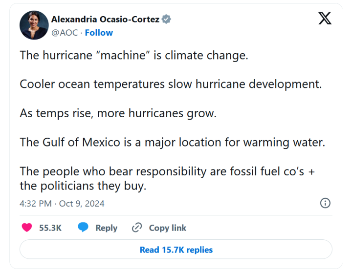 Politico, a left-wing political newspaper, headlined, “Hurricanes do little to move Republicans on climate.” They stated that, “Republicans have to do more than the bare minimum to prevent hurricanes like Helene and Milton from happening in the first place.”