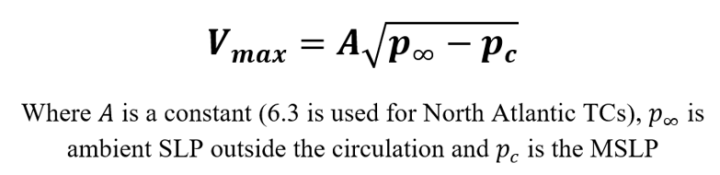 The mechanics of this are simple. Pressure falls at the core of the cyclone tighten the horizontal pressure gradient between the eye and the ambient environment. In an attempt to equalize the pressure deficit, air parcels will accelerate toward the storm’s center, thereby increasing the Vmax. The relationship between TC Vmax and MSLP can be approximated by: