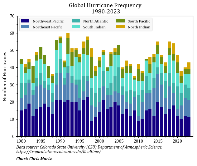 Author’s note: Although operational satellite records used to monitor the Northern Hemispheric TC activity date back to 1966 with the launch of NASA’s ESSA-1 and ESSA-2 satellites, it wasn’t until around 1980 that there was ample satellite coverage over the South Pacific and South Indian oceans. Resolution of satellite imagery has also vastly improved over the last several decades. Unsurprisingly, both TC tallies and intensities were certainly underestimated prior to the 1980s (e.g., Landsea et al., 2006).[13]