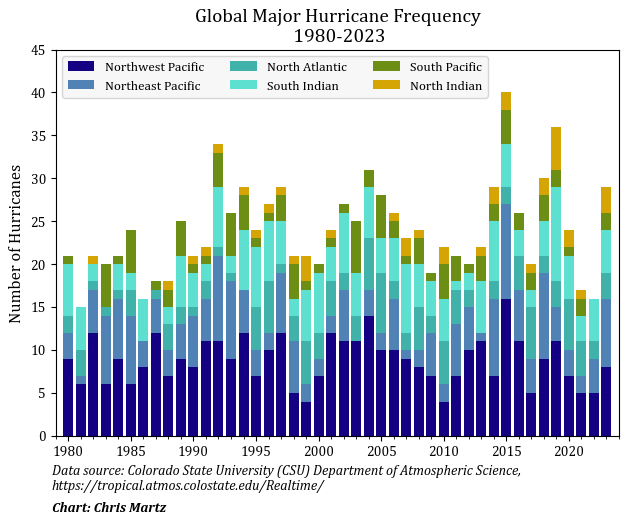 In a broader sense, there has been no global-scale increase in the annual number of hurricane-strength TCs since 1980, which is plotted in the following bar chart. In fact, the trend is markedly down. These findings are backed by recent studies such as Knutson et al. (2019) and Klotzbach et al. (2022).[11] [12]