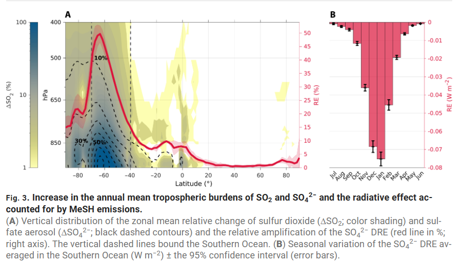 “The large anthropogenic contribution to the SO42− burden outside of the pristine Southern Ocean dwarfs the global mean MeSH-mediated DRE, which increases by 4% (−0.016 W m−2).”