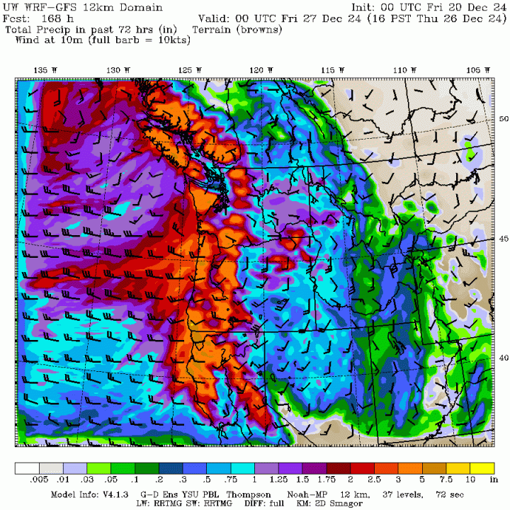 For the 72 h ending 4 PM Thursday, there will be massive precipitation totals predicted (by the UW model) from northern CA through BC, with northern CA/SW Oregon getting hit hardest (over 5 inches).