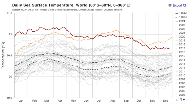 The OISST2.1 World SST (by 12/27) the 2024 average is at 20.94°C vs 20.89°C for 2023. Why?
