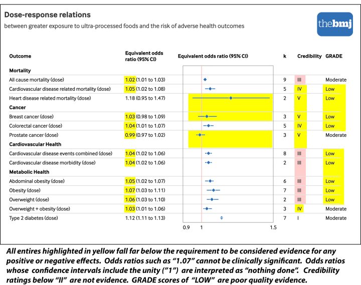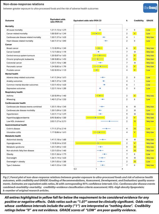 We will see this same pattern repeated through all the major systematic reviews of the UPF issue: Tiny ORs/HRs, ORs/HRs with CIs that include ‘1’, studies included in reviews even though they are of Low and Very Low quality, low Credibility Scores due to type of study, studies that measure a vague, not agreed upon, shifting and ill-defined range of foods – labeled UPFs – and results claimed for a broad heterogeneous range of foods.