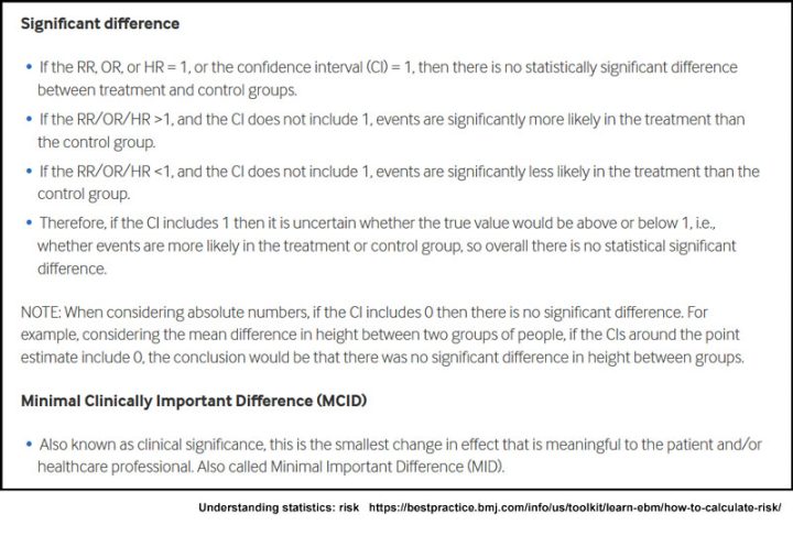 2. In all charts, any highlighted finding with Confidence Interval whiskers that include “1”, there is no significant difference – or, in plain English, “nothing done” and the effect cannot be considered either positive or negative. These individual finding should not be included in any overall result of the study and not combined with other findings for an “overall score”.