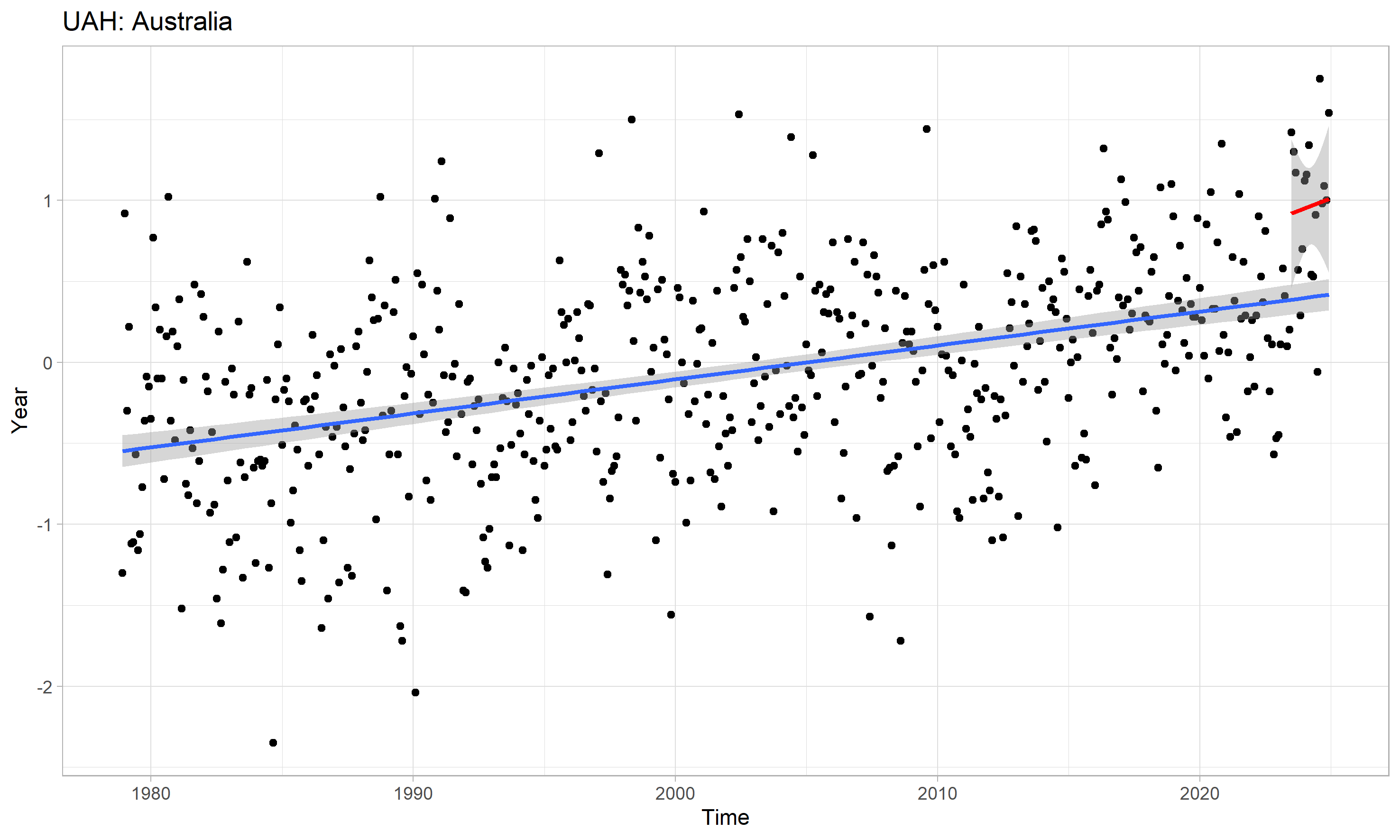 Readers have requested a graph showing UAH anomaly temperatures over the Australian land mass since observations began.