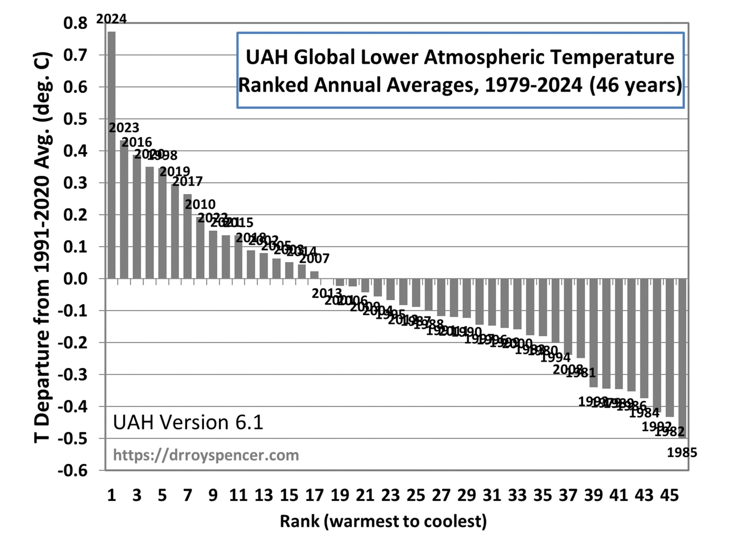 As seen in the following ranking of the years from warmest to coolest, 2024 was by far the warmest in the 46-year satellite record averaging 0.77 deg. C above the 30-year mean, while the 2nd warmest year (2023) was +0.43 deg. C above the 30-year mean. [Note: These yearly average anomalies weight the individual monthly anomalies by the number of days in each month.]