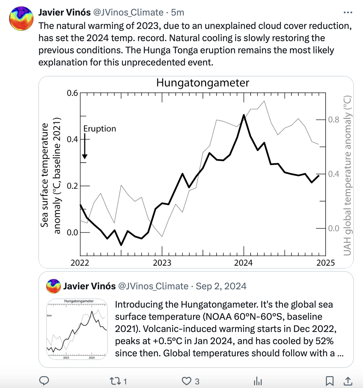 Funny how you put words in AlanJ’s mouth that he did not say. He simply observed what we can all see, that 2024 is a dramatic departure (anomaly?) in the satellite record. It doesn’t mean CO2 or humans were the cause. In fact the sudden increase essentially refutes the notion that CO2 or humans were the cause, since neither changed dramatically in 2024. The sudden—and likely transient—warming is just an interesting fact. I’m curious to know what the primary drivers are. Some have suggested the Hunga Tonga volcano ejecting a massive plume of water vapor into the upper atmosphere. Maybe. Whatever the reason, it would be interesting to know.