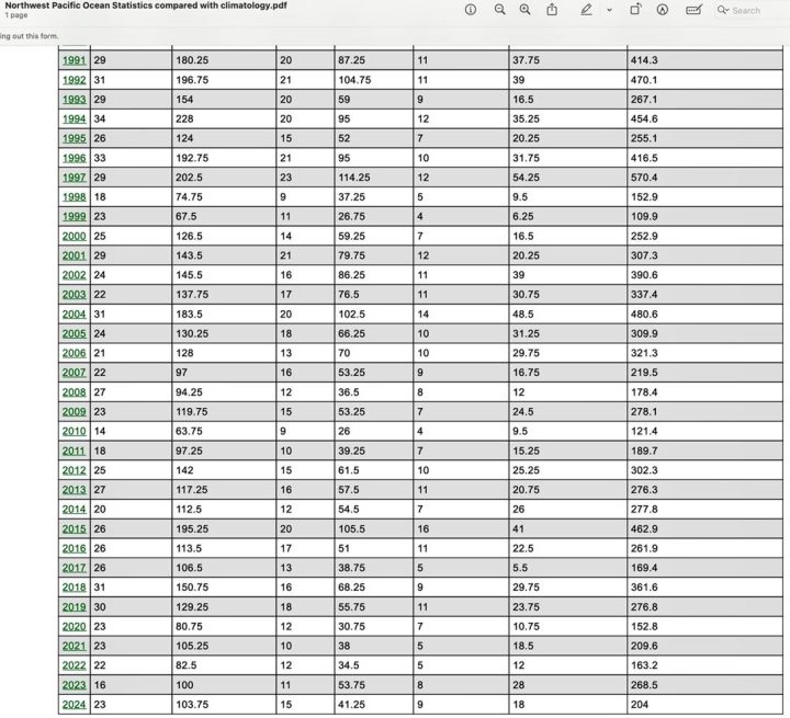 Provided below are the Climatology data for each of these three regions (Pacific Northeast Ocean, Pacific Northwest Ocean and North Indian Ocean) with the year 2024 ACE outcomes shown to be far below the “normal” value at only 61.8%, 68.1% and 30.9% respectively of the 1991 to 2020 Climatology average values.