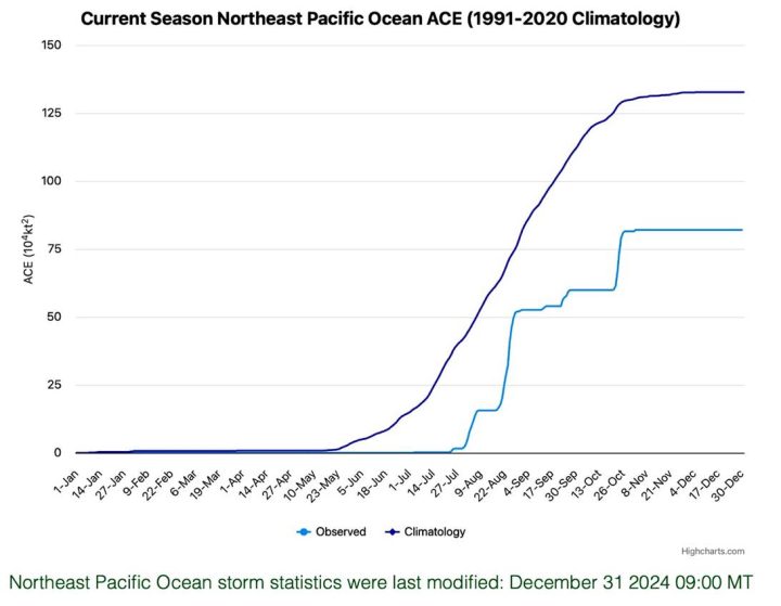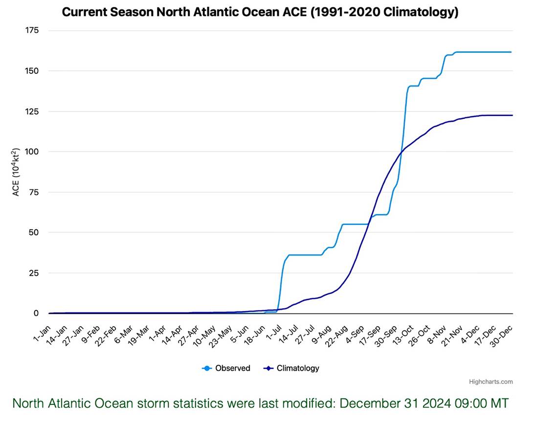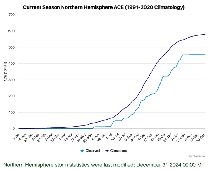 Global Northern Hemisphere data from Colorado State University for the year 2024 hurricane season shows that the Accumulated Cyclone Energy (ACE) for this latest season of 455.1 is only 78.6% of “normal” (lower than the 30-year 1991-2020 Climatology hurricane storm season average of 579.2 as presented in the graph below with data through December 31, 2024) and less than the year 2023 value of 636.6 (as presented in the table below).