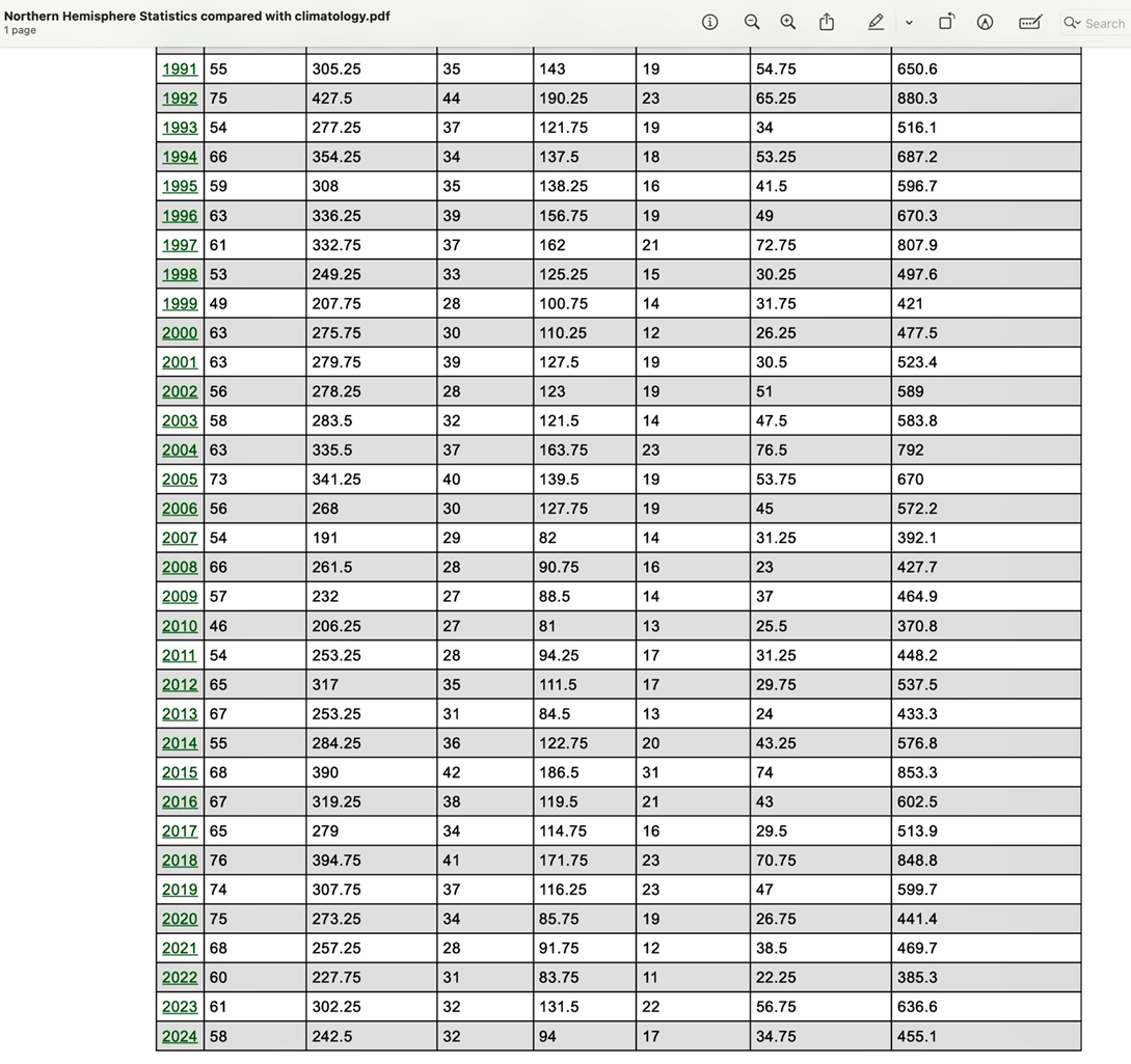 The highest ACE value measured for the Northern Hemisphere oceans over the 1991 to 2020 Climatology period was 880.3 in 1992 (as presented in the table below) nearly double the 2024 ACE measured outcome.