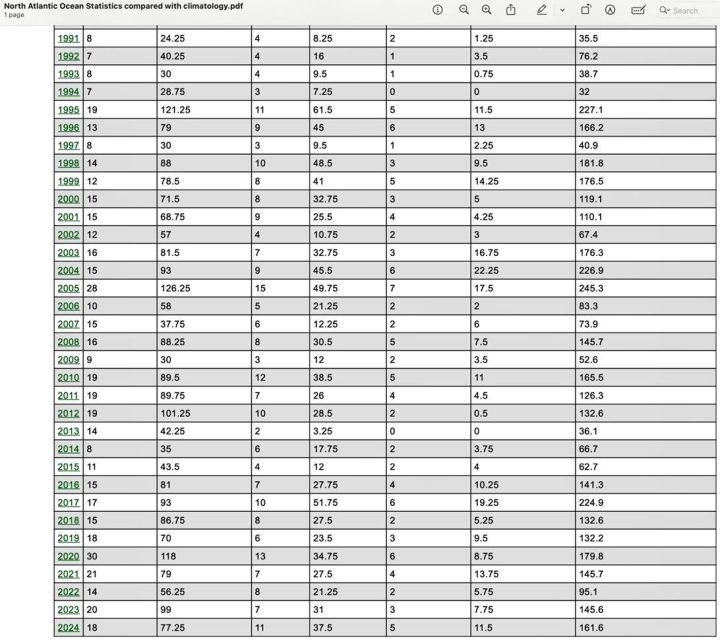 Furthermore, the table shows year 2024 values for these measures are significantly lower than prior highest year measurements occurring (455.1 ACE in 2024 versus 880.3 in 1992, 17 in 2024 versus 31 in 2015 for number of major hurricanes and 32 in 2024 versus 44 in 1992 for number of hurricanes) during this climatology period. Also, the 17 major hurricane occurrences in 2024 were exceeded in 18 other years during the Climatology period and the 32 hurricanes occurrences in 2024 were exceeded in 19 other years during this 1990 to 2020 period as well.