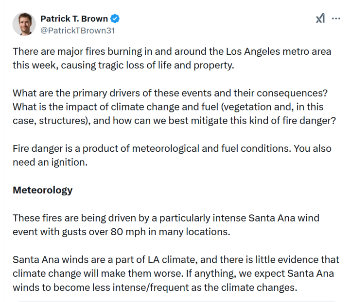 Patrick Brown has crafted an insightful and balanced analysis of the Los Angeles wildfires, breaking down the interplay of factors like meteorology, fuel conditions, and human activity. His post challenges the dominant narratives that overemphasize climate change as the sole culprit, offering a nuanced and data-driven perspective. With clear-eyed attention to practical solutions—like home hardening, fuel management, and ignition prevention—Brown provides a roadmap for mitigating fire risks without resorting to alarmist or impractical global policies. It’s a refreshing, must-read take on an issue too often clouded by ideology. The following is a section by section commentary on his post.