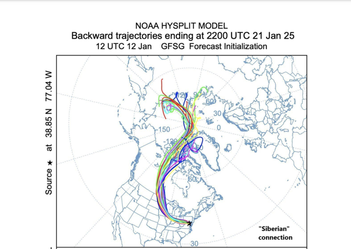 Some of the air that reaches the Mid-Atlantic region early next week will have its origins from the other side of the North Pole over Siberia. Indeed “backward trajectory” models trace the origin of air parcels that reach the Mid-Atlantic region by Tuesday, January 21st, back to a land mass that is known for its brutally cold air this time of year. Plot courtesy NOAA