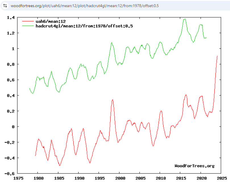 So if we’d get 2°C of warming from a doubling of CO2 (which, contrary to most CMIP models, is a generous ECS estimate!), we could expect only 0.863% of that, or 0.017°C, from one year’s CO2 increase. Over just six months you should expect half that (and, of course, the effect is not instantaneous).