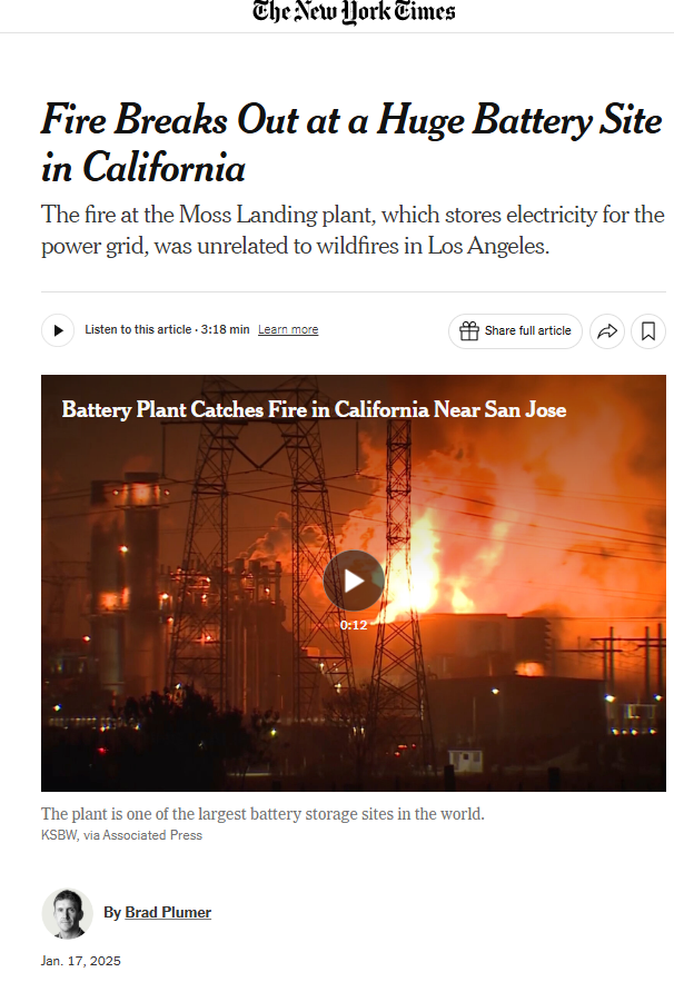 Back here in New York, my friend and co-author Richard Ellenbogen sends me an email pointing out that we have a large grid-scale battery storage facility moving toward construction on the East bank of the East River right across from Midtown Manhattan. I don’t find whether construction has actually begun, but this project has been in the works for years, and has gotten multiple regulatory approvals. Here is a piece from the New York City Economic Development Corporation indicating that the financing for the project was closed in May 2024. My friend Ellenbogen points out that the technology is the same as the Moss Landing facility in California, and a 12 square mile evacuation zone around this facility would include a big chunk of Midtown Manhattan and another big chunk of densely-populated Western Queens — hundreds of thousands of people, instead of the paltry 1200-1500 just evacuated out in California. What are our New York pols thinking? Actually, the EDC press release quotes a bunch of them. Here are a couple of quotes: