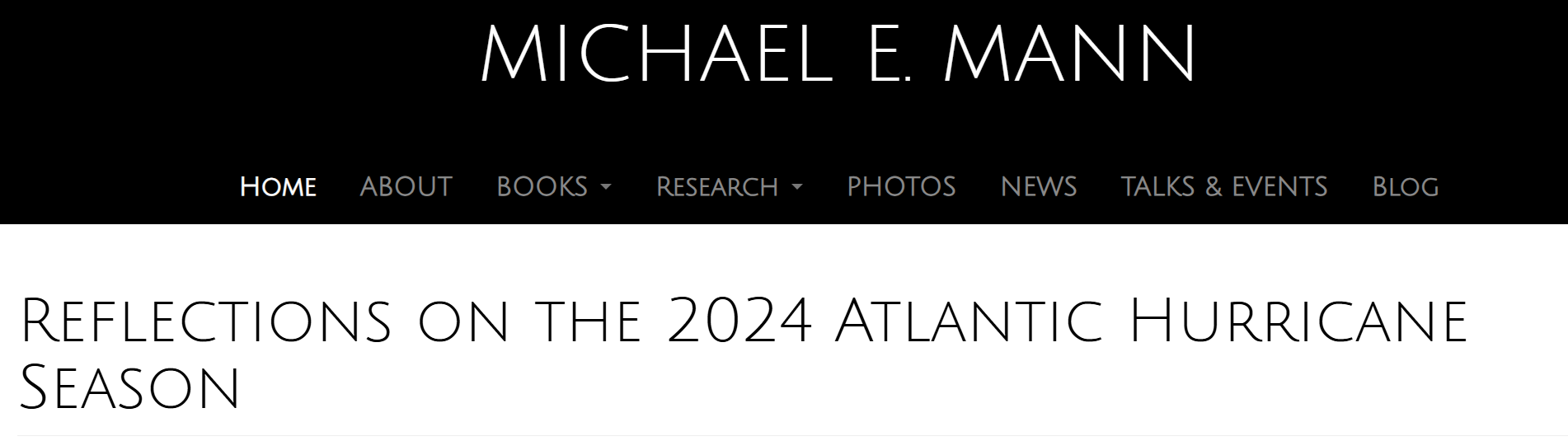This misalignment extends to his forecasts. Mann and his team predicted an “extremely active” hurricane season, with a most likely estimate of 33 named storms. Instead, the season produced just 18—or 19 if we generously include a borderline case. For perspective, this falls well below Mann’s projected range of 27–39 storms. Not exactly the “record-shattering” season anticipated.