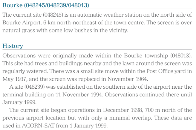 NOTE 1: Many of these stations underwent a site shift, many in the middle of the study period, typically from a Post Office to an Airport. This has affected the distribution over time of these hottest heatwaves. There is no reliable method to adjust this by a single step change because the magnitude of such a step is not now knowable.
