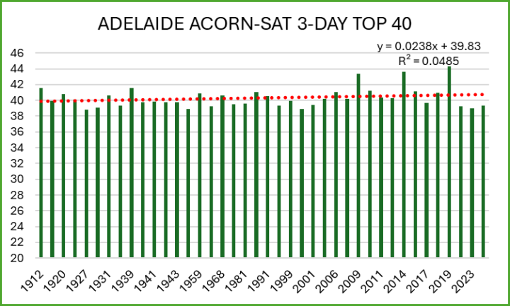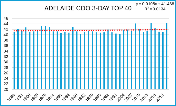 Note 2: Many Australian weather station temperature results (not heatwaves) have been examined in detail by colleague Dr Bill Johnston and reported on his Bomwatch blog. By correcting for a physics-based influence of rainfall, he has deduced that most Australian stations show essentially no warming over the whole period of their observations. It should follow that heatwaves likewise have not shown increases or decreases.