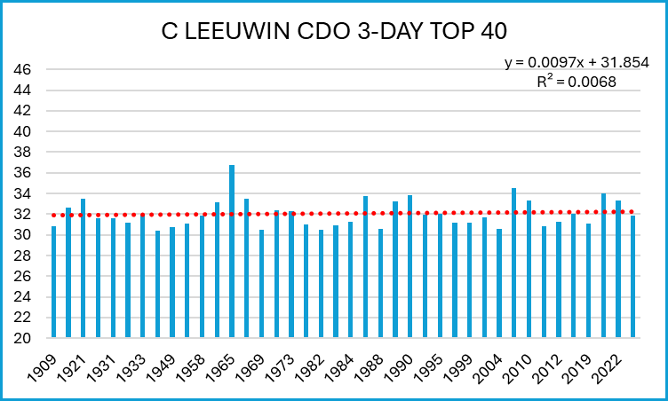 Do you see the point that Dr Pielke was making? Year 2023 does not even make the Top 40 3-day heatwave summary for Cape Leeuwin, below; nor for Perth; nor the 1-Day, 5-Day or 10-Day heatwave Top 40 list for both stations.