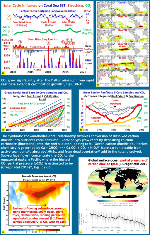 From my 2020 Sun-Climate Symposium poster. Coral reef base growth has coincided with ocean warming since the Maunder Minimum, and coral bleaching events have occurred from El Niño events and periods of high solar irradiance, contributing to the production of excess atmospheric CO2 anomalies.