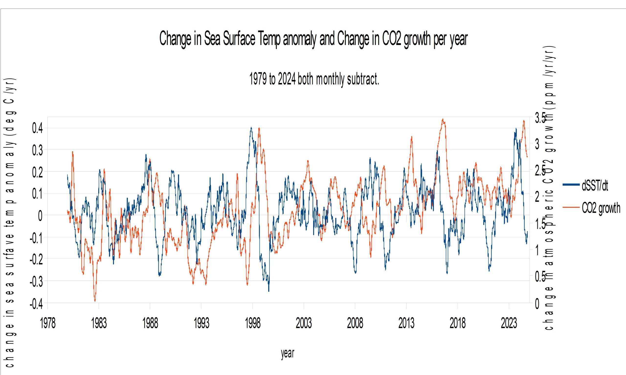 Really? Your assertion of a heat transfer time-lag in your offered sequence must be compared to UAH data showing oceans warming at an average rate of +0.13 C/decade for the last 46 years compared to land warming at an average of +0.22 C/decade over the same time. This doesn’t reveal any time-lag as much as it reveals a difference in effective heat capacity (oceans much greater than land) for typical Earth surface temperatures in the range 210-320 K. Also, across this temperature range, the oceans have slightly higher LWIR emissivity (~0.98) than averaged land surfaces (~0.95), so this also a small but accountable difference.