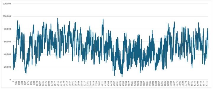 Figure 5: US Energy Information Administration Hourly Electric Grid Monitor 2024 Hourly Wind Energy Production (MW)