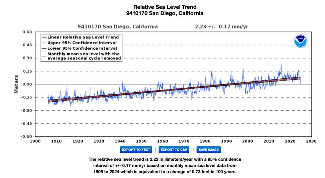Looking at NOAA’s year 2024 data for the San Diego Station location we see the 2024 mean sea level trend rate of 2.23 +/- 0.17 mm/yr which is the same as in year 2023.